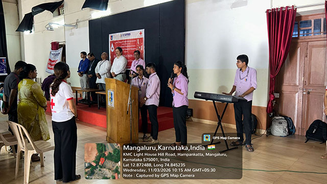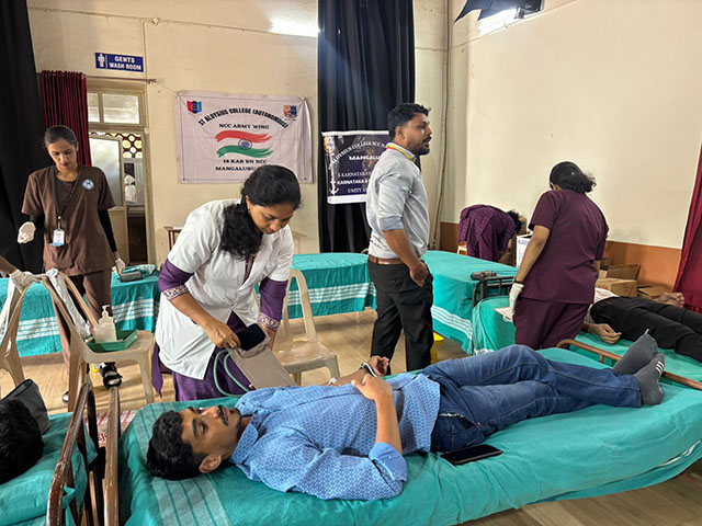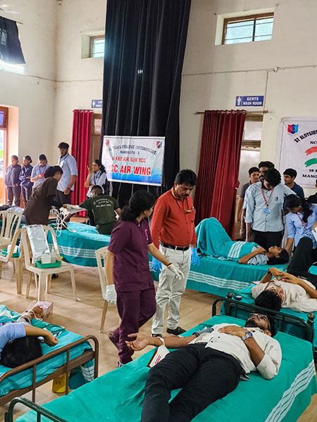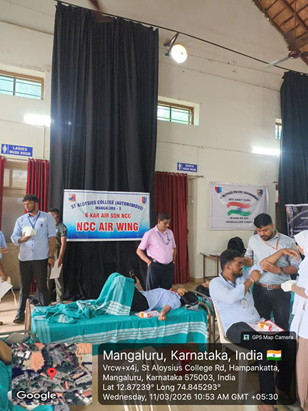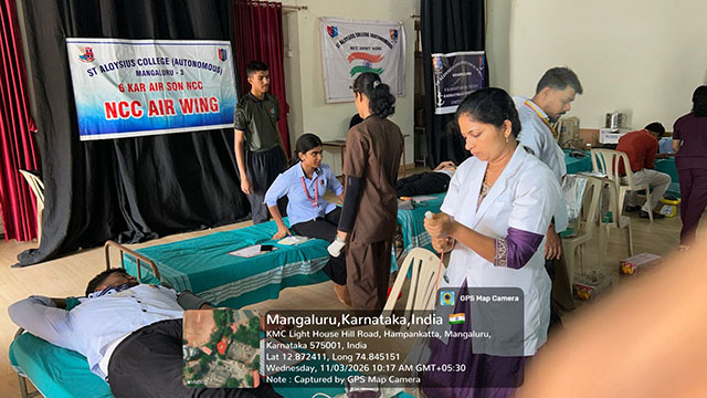 Mangaluru, Mar 11: In response to the acute blood shortage in the city, the NCC wings and the Youth Red Cross Association of St Aloysius (Deemed to be University), Mangaluru, in collaboration with the Regional Blood Transfusion Centre, District Wenlock Hospital, Mangaluru, organised a blood donation camp on March 11 from in the Sahodaya Auditorium.