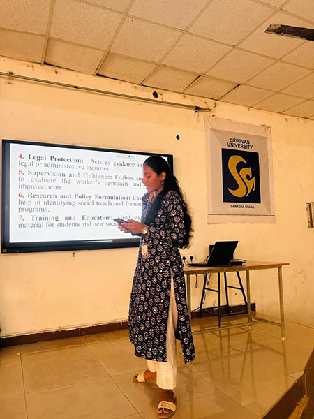 During her presentation, the speaker explained that social casework recording involves systematic documentation of a client’s background, problems, interventions and progress. She emphasised that proper recording helps maintain professional accountability, ensures continuity of care and supports effective communication among professionals.