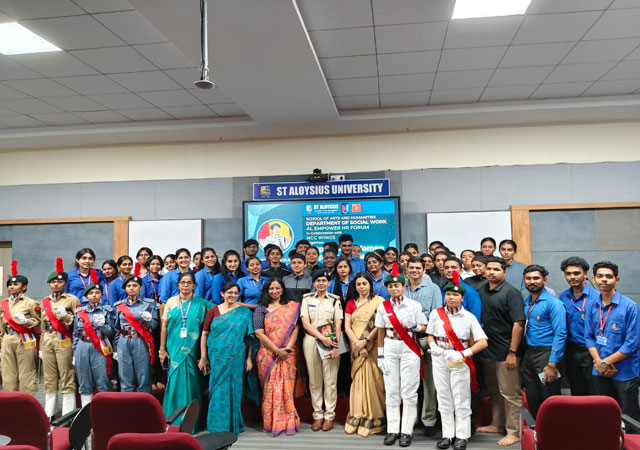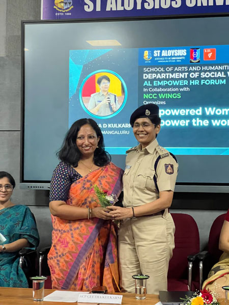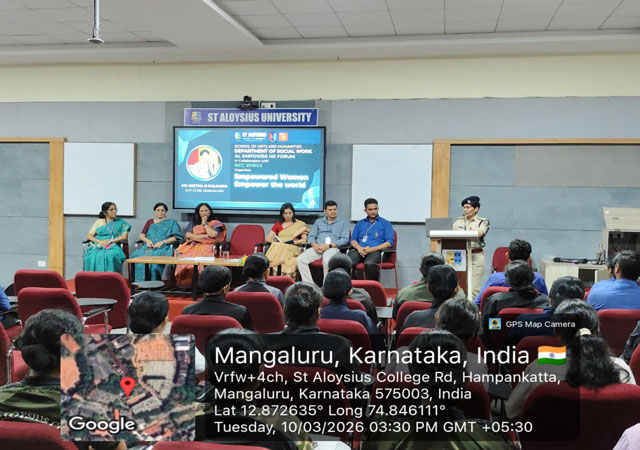 Mangaluru, Mar 13: The Al-Empower HR Forum of the department of Social Work, School of Arts and Humanities, St Aloysius (Deemed to be University), in collaboration with the NCC Wings Corps, organized a programme titled ‘Empowered Women, Empower the World’ on March 10 in Saanidhya Hall as part of the International Women’s Day celebration.