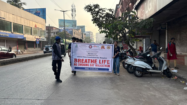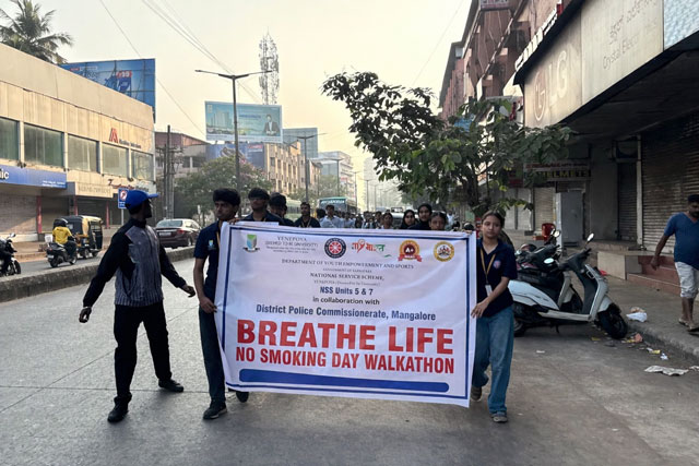Dr Rathnakar Shetty, head of the Department of Computer Science, faculty members and more than 100 NSS volunteers participated enthusiastically in the walkathon, carrying awareness messages and encouraging the public to stay away from tobacco and smoking.