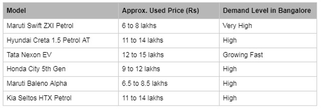 Here are approximate used car price ranges in Bangalore for popular models in good condition, based on 2020 to 2022 manufacture years: