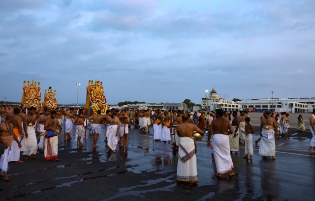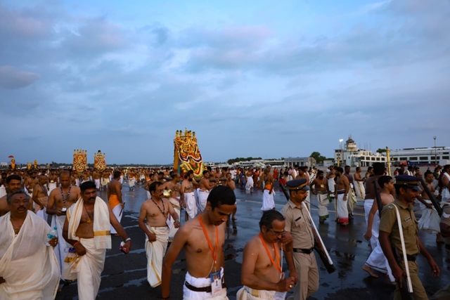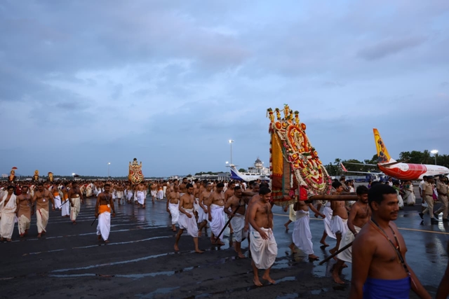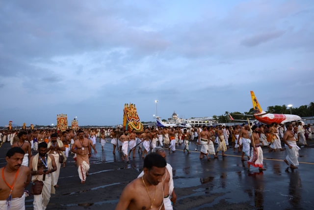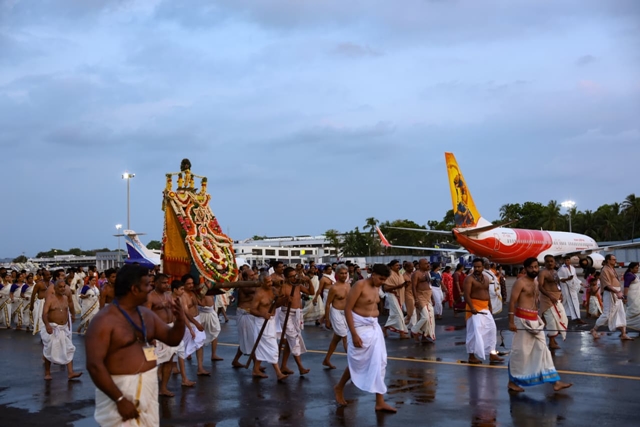 On the final day of the 10-day festival, idols of Lord Padmanabhaswamy, Narasimha Moorthy and Krishna Swamy were carried in a ceremonial procession from the temple to Shanghumugham Beach, about six kilometres away. The route passed directly across the airport’s runway, reflecting its origins under the erstwhile Travancore royal family, which built the airport in 1932.
