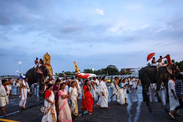 Accompanied by caparisoned elephants, traditional percussion and members of the royal lineage, the procession paused briefly near the runway before continuing to the Arabian Sea for the ritual bath. The return journey unfolded after dusk in a torch-lit procession, marking the close of the festival.