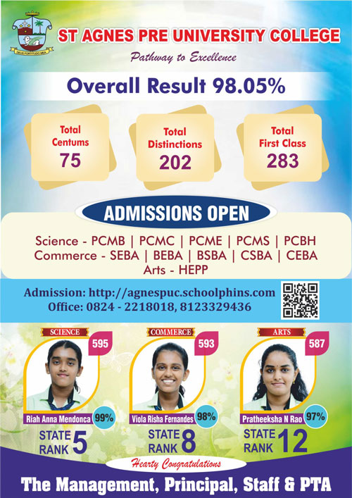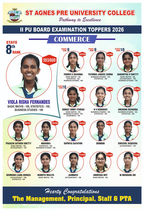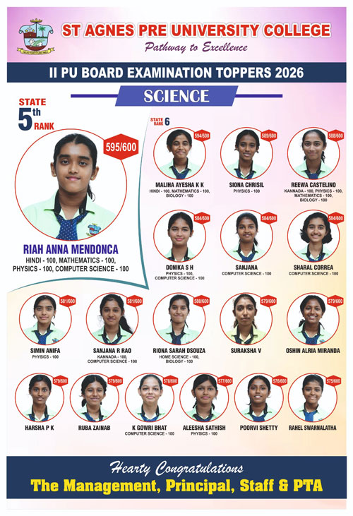 Mangaluru, Apr 10: St Agnes PU College has carved a niche for itself in academic excellence with an outstanding performance in the II PU Board Examination 2026. The principal and staff take immense pride in the remarkable achievements of their students, whose insatiable drive for hard work and commitment has yielded noteworthy results across all streams.