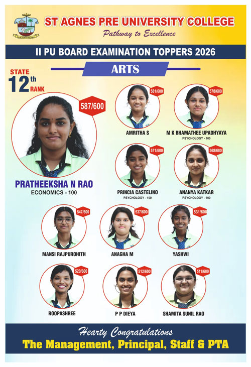 In the arts stream, Prateeksha N Rao garnered a praiseworthy total of 587 marks and a perfect score in economics. She has made us proud by securing the 12th rank at the state level.