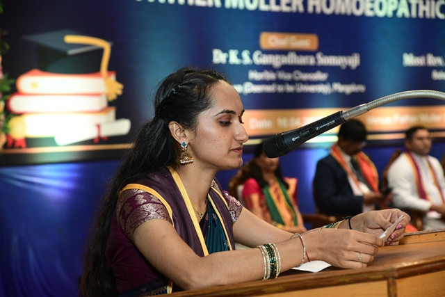 In his graduation address, Dr K S Gangadhara Somayaji described the day as a transition into licensed practice. He emphasized the holistic, patient-centred approach of homoeopathy and urged graduates to respect their alma mater, teachers, and parents while pursuing further research.