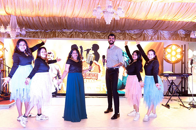 The band soon had the entire hall on its feet as they delivered an energetic musical journey blending Hollywood, Bollywood, classic Konkani hits, and traditional Baila music. The audience sang, danced, and celebrated together, creating an unforgettable atmosphere.