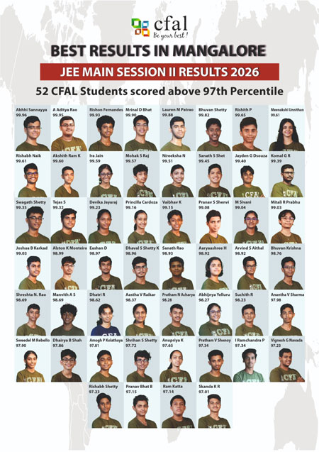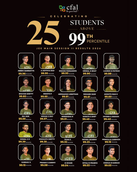 Mangaluru, Apr 22: Twenty-five students from Mangaluru have scored above the 99th percentile in the JEE Main 2026, placing them among the top 13,000 of over 13 lac candidates nationally. Four of these students crossed the 99.9 percentile, ranking them within the top 1,300 in the country. All 25 are students of CFAL Institute, a centre for advanced learning founded in the city in 2004.