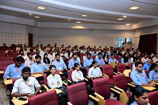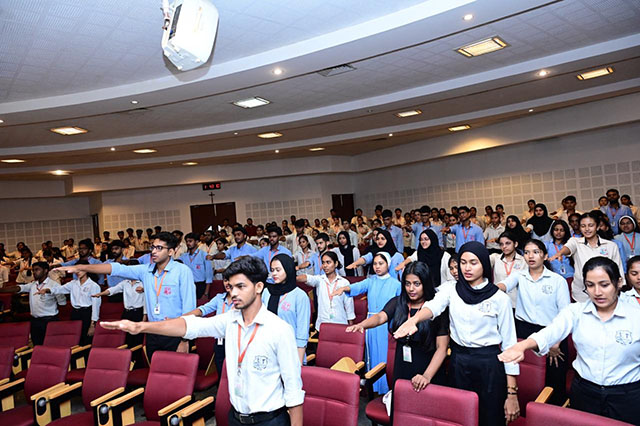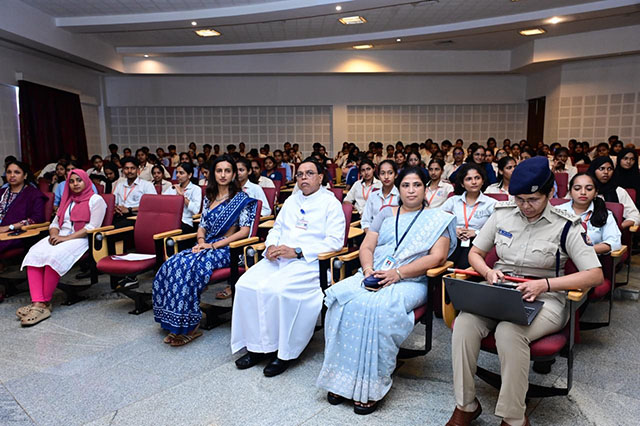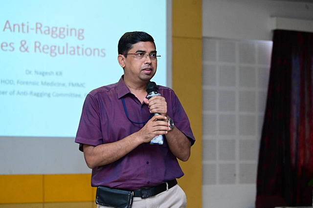 The programme commenced with a session on the anti-ragging policy for first-year students. Dr Nagesh K R, professor of forensic medicine at Father Muller Medical College and convener of the Anti-Ragging Committee, sensitized students on the serious consequences of ragging, relevant legal provisions, and the importance of fostering a culture of respect and empathy within academic institutions. Students actively participated and took a pledge to maintain a ragging-free campus.