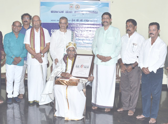 Mangaluru, Apr 27: Veteran theatre personality K K Gatti was honoured with the prestigious ‘Chavadi Thamman’ award by the Karnataka Tulu Sahitya Academy at a programme held in the auditorium of Sri Sharavu Mahaganapathi Temple in Mangaluru.