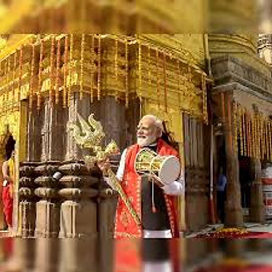 Modi performed darshan and offered prayers at the temple, and was seen holding a Trishul and Damru, a gesture carrying religious symbolism.